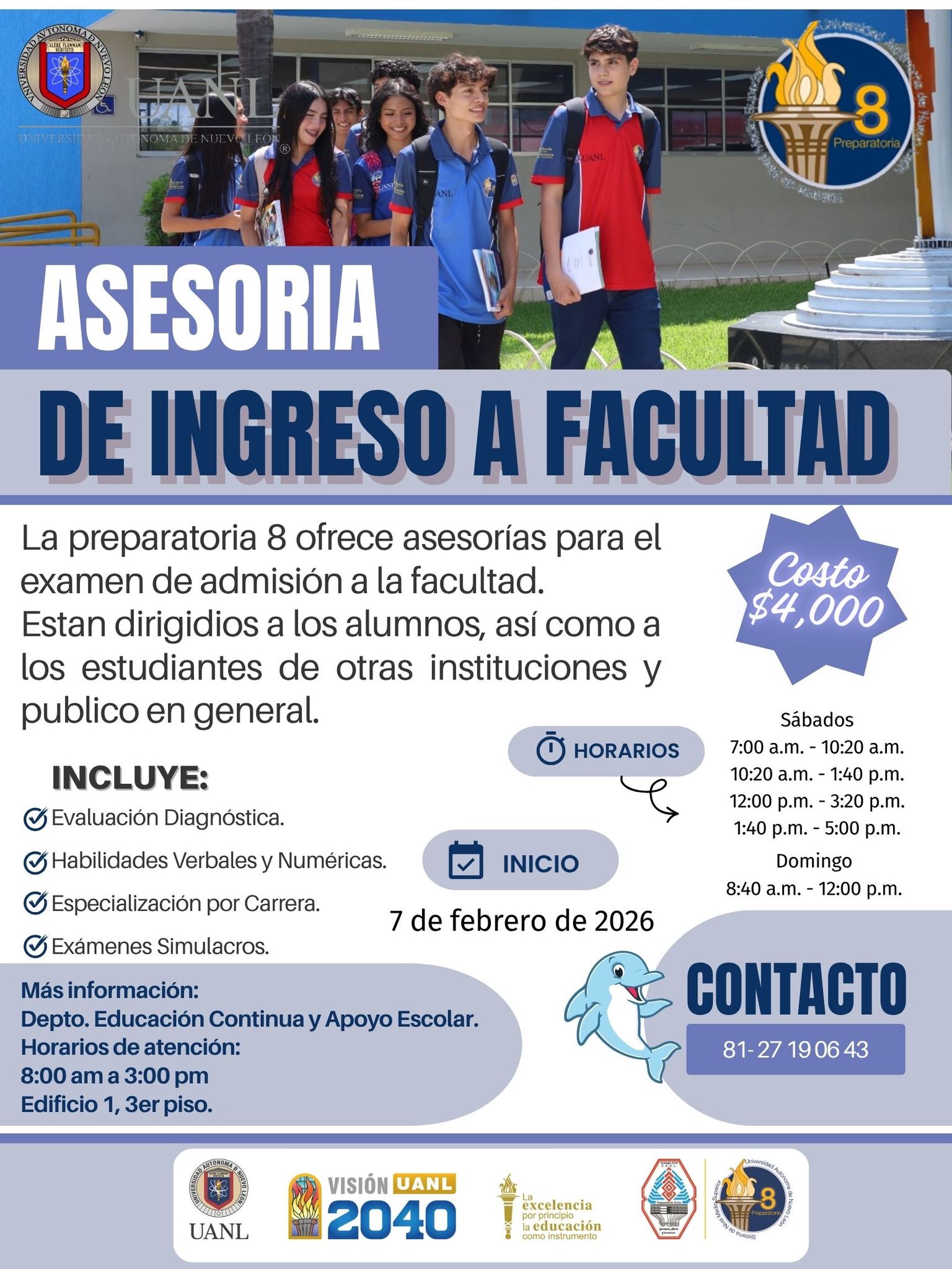 La Preparatoria 8 ofrece asesorías para el examen de admisión a la facultad. Están dirigidas a todos los alumnos que están por finalizar su bachillerato y aspiran un lugar en una de las 26 facultades UANL.
